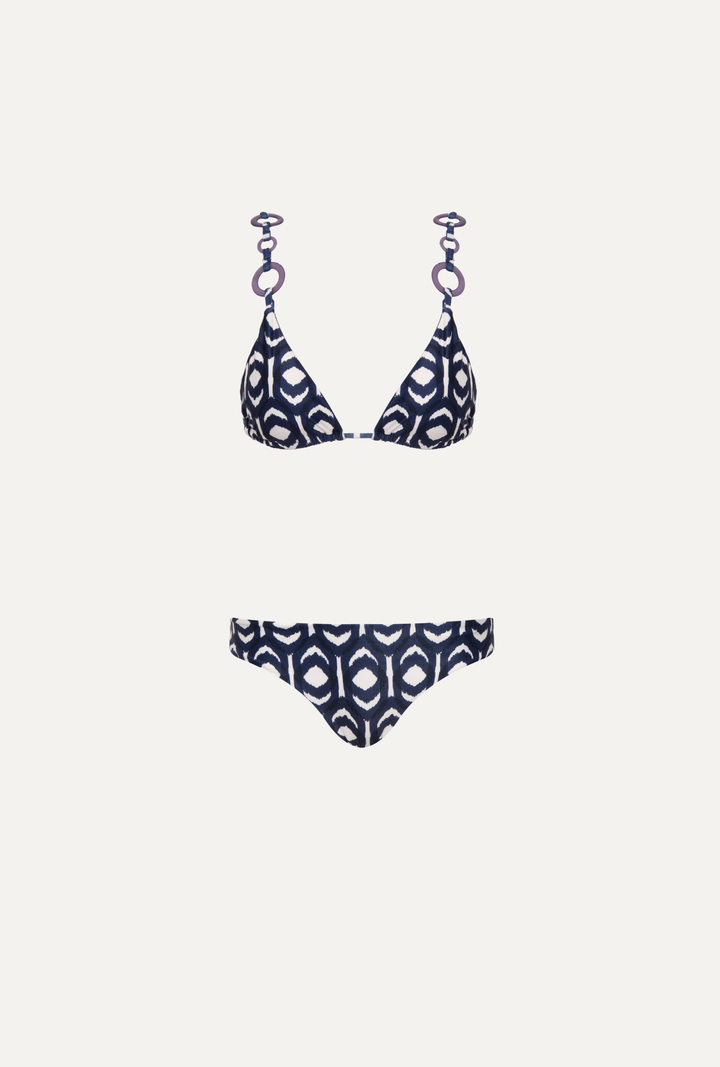 Top triangular, pads removibles, amarre en cuello y espalda. Detalle de aros.